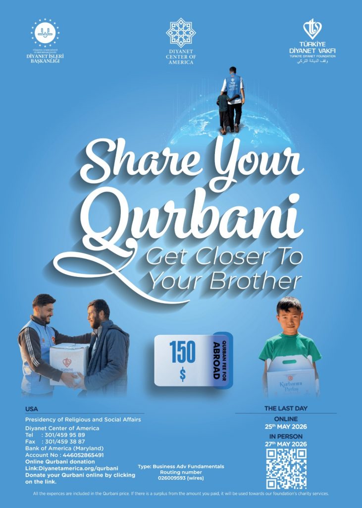 Bu bayram dünya çapındaki mazlum ve muhtaç kardeşlerimize sevinç taşımak için şimdi bağış yapın. Amerika Diyanet Merkezi'ne yapacağınız kurban bağışınız, ihtiyaç sahibi ailelere et ulaştıracaktır.